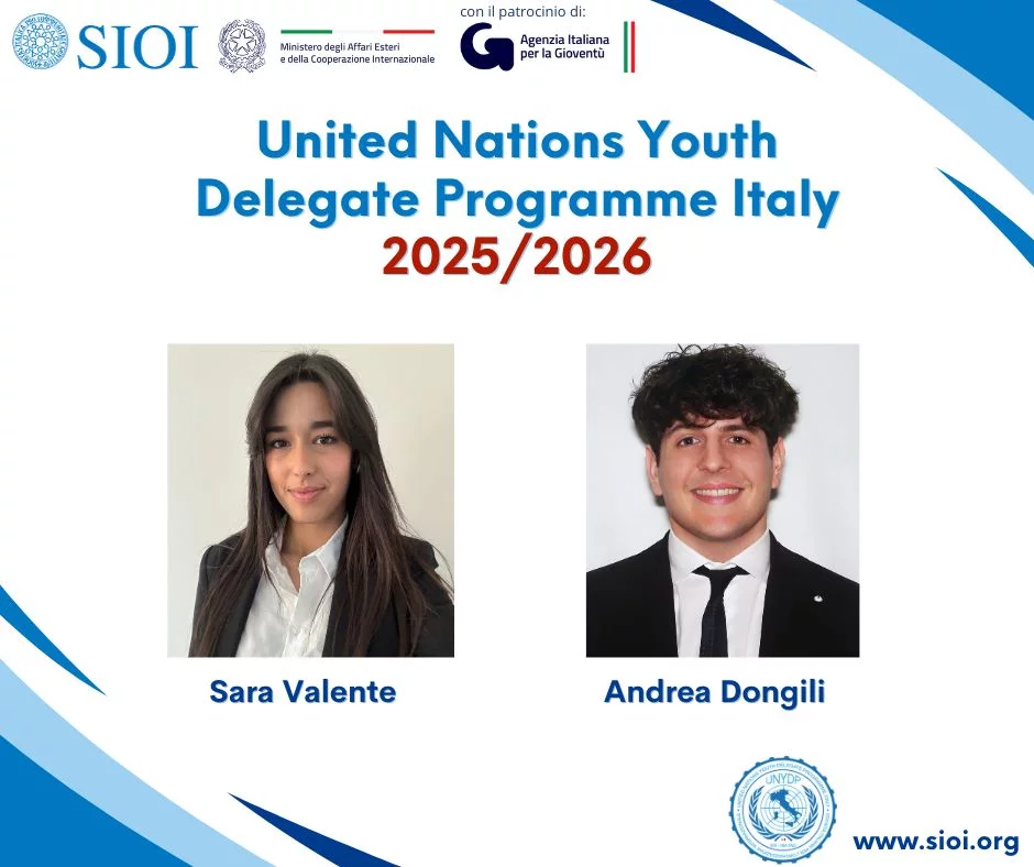 ROMA, 2 LUGLIO: Con la nomina di Sara Valente e Andrea Dongili prende il via una nuova edizione del programma “Giovani Delegati italiani alle Nazioni Unite”, attuato dalla SIOI in collaborazione con il Ministero degli Affari Esteri e della Cooperazione Internazionale.