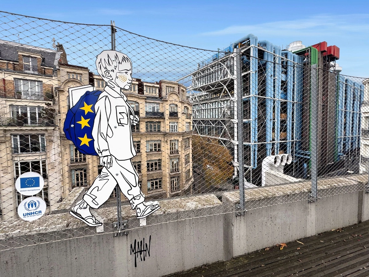 A Parigi, l’artista Mahn Kloix ha trasformato il tetto e le pareti dell’Ecole Renard, situata nel IV arrondissement, in un commovente omaggio al percorso dei bambini rifugiati verso l’istruzione. The Extra Mile raffigura sagome a grandezza naturale di bambini rifugiati provenienti da Venezuela, Siria, Ucraina, Sud Sudan, Myanmar e Afghanistan che camminano verso la scuola: una celebrazione della perseveranza e della collaborazione, mentre UNHCR e UE lavorano insieme per avvicinare i bambini costretti a fuggire ai loro sogni.