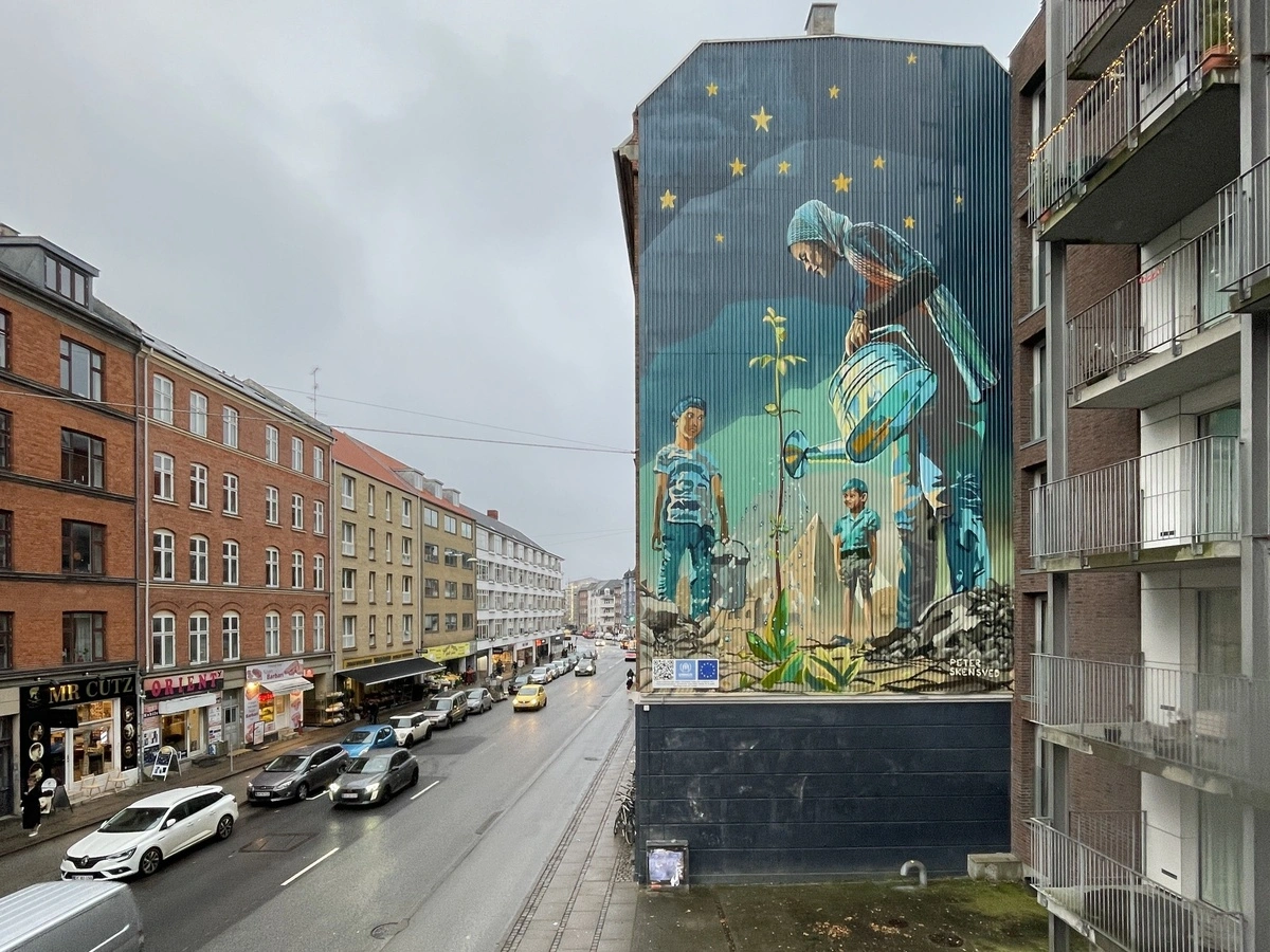 Nell’area Nordvest di Copenaghen, il murale Resilient Roots dell’artista Peter Skensved porta una ventata di speranza e colore a Frederikssundsvej, una delle arterie principali della città. Raffigurante una famiglia di rifugiati che ricostruisce la propria vita – una fenice che risorge dalle macerie di un passato turbolento – lo sfondo del murale è composto da toni scuri e desaturati: un paesaggio di sogni infranti sotto un cielo che conserva ancora tante promesse. Dodici stelle gialle su sfondo blu richiamano sottilmente il coinvolgimento e il sostegno dell’UE al lavoro dell’UNHCR. In primo piano, la luce e il rinnovamento prendono il sopravvento: un ruscello d’acqua che nutre una giovane pianta, simbolo di speranza e di nuovi inizi. (@OnuItalia)