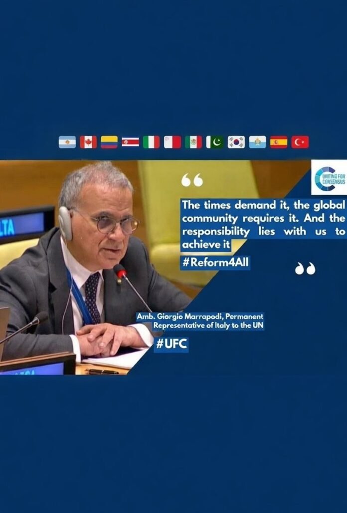 Il gruppo UfC — che riunisce Argentina, Canada, Colombia, Costa Rica, Italia, Malta, Messico, Pakistan, Repubblica di Corea, San Marino, Spagna e Turchia — si definisce pro-riforma, trasversale e diversificato, e sostiene un ampliamento del Consiglio capace di rafforzarne efficacia, rappresentatività, democratizzazione e responsabilità verso l’intera membership.
